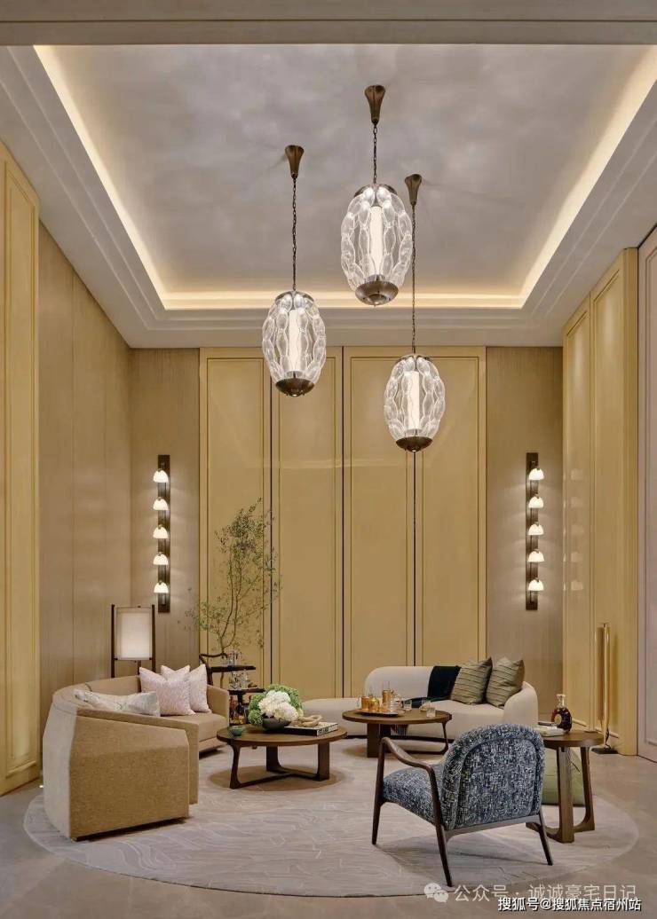 顶层下午茶区以淡绿为底,壁炉暖光漫过手绘地毯的肌理,将社交场域沉淀为冥想容器;主人房墙面缟玛瑙(Onyx)的天然流痕,也与一层屏风暗纹形成时空对位,光影在矿物晶体中生长出私密的诗。