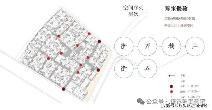 士林润园社区规划可分为蓬莱路城市公共景观以及社区内部景观两个部分,其中市政绿地衔接于上海2035城市总体规划中“蓝绿丝带”的上位条件要求,社区内部街巷空间形成空间序列形成递进的层次,将归家体验的序列依次展开,形成城市街道→入口(一级门户)→街巷→节点空间→里弄门(二级门户)→合院入户(三级门户)的方式,基本可保证大多数住户可体验到两重以上的空间递进。
