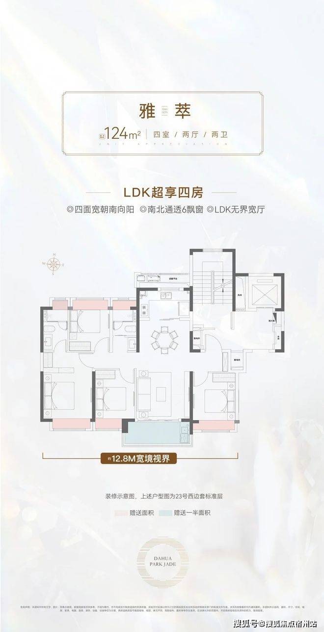 建面约124㎡四房是四开间朝南布局,电梯厅看着做了额外的隔档,可以形成类似私家电梯厅的额外利用空间。