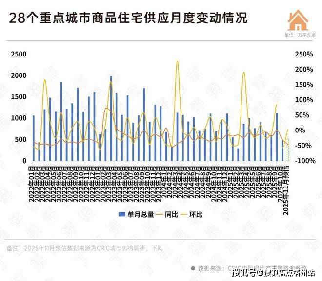 据CRIC调研,11月28城预计新增商品住宅供应面积518万平方米,环比微增5%。