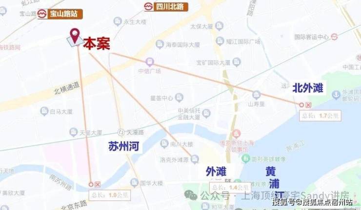仅从图上看,该地块直线距 苏州河约1公里,直线距 外滩约1.4公里,直线距 北外滩约1.7公里,直线距 3/4号线宝山路站约300米,直线距 10号线四川北路站约560米,区位优势明显。