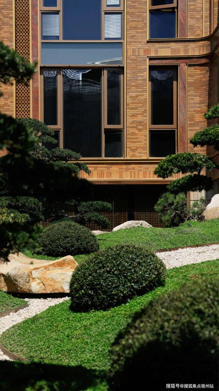 例如,在社区入户,目前已经完美呈现出来的,有强烈视觉冲击的立面 大量的红砖、红洞石及大面积的落地弧形玻璃搭配的相得益彰,整个门头既有厚重的历史感,又不失极简主义的现代美。
