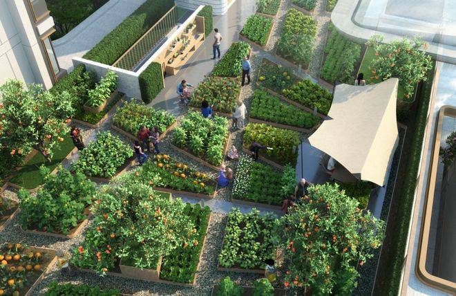 参考成都麓湖生态城沚院项目,回应深植国人心中的田园情结,在配套用房屋面打造都市菜园。