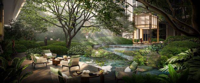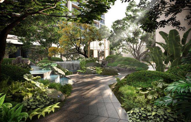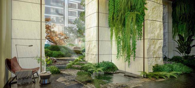 反复考量水景面积、叠水水深、水体吨数,精确计算出能耗比,最后将社区约300㎡的水景区域,科学划分为5个相互呼应的独立模块,并分别配备循环系统,结合业主每天的生活场景,规划不同模块水系开放时间。