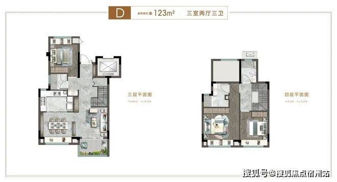 约123平上叠3房户型,共上下两层,全明设计,格局开阔,宽景阳台,上承天空,下承生活。