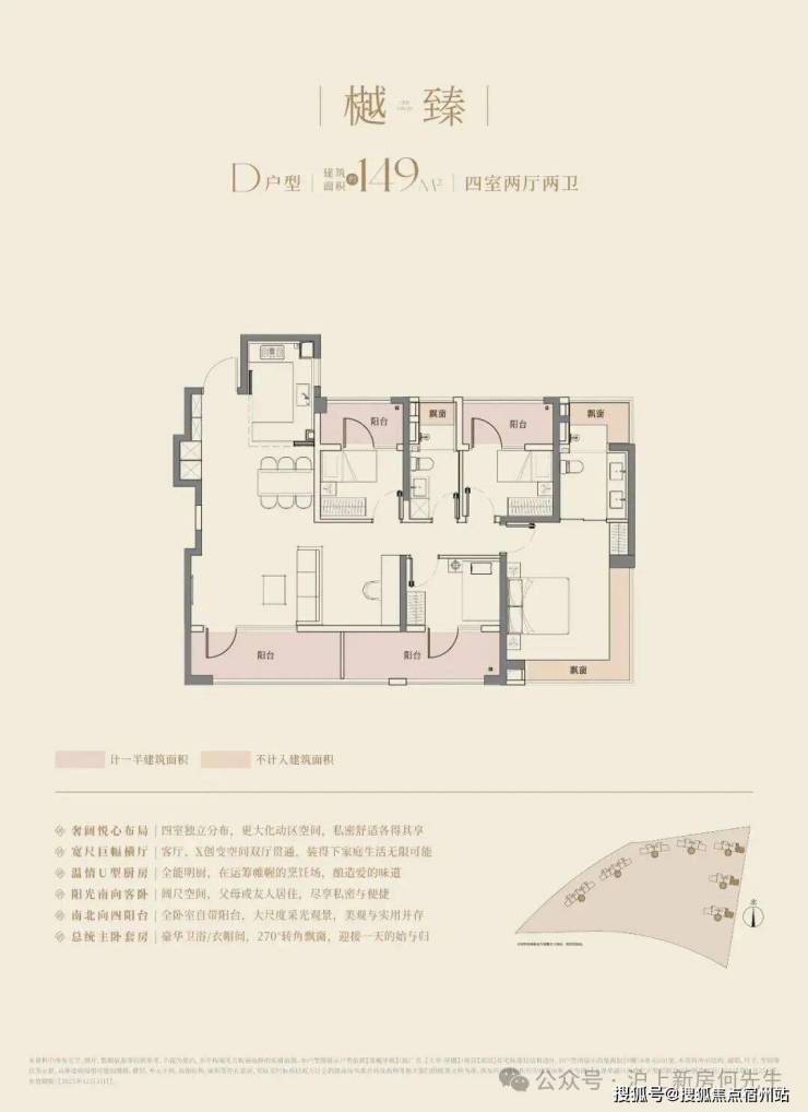 经典动静分离户型,4.5开间朝南+南北四阳台,阳合仅计算一半建筑面积,主卧以及主卫附赠270°转角飘窗;