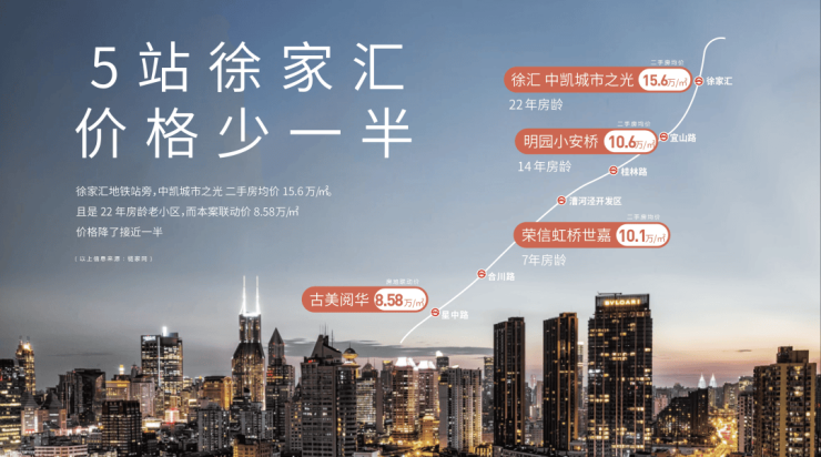 5站可达徐家汇,徐家汇二手次新房均价达15.6万/㎡,5站地铁价格几乎减半,性价比优势极为突出。