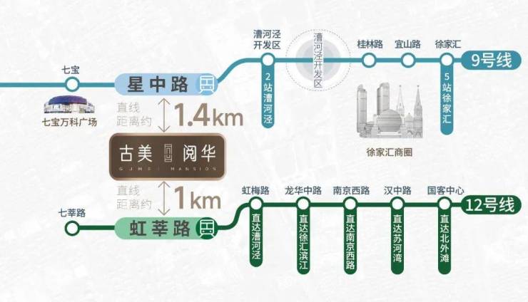 坐拥双轨交交通大动脉,12号线直达漕河泾、徐汇滨江、南京西路、苏河湾、北外滩等核心板块;9号线1站可达七宝万科、 5站徐家汇、13站浦东陆家嘴、世纪大道等;规划中的嘉闵线未来可联通大虹桥枢纽 ,畅通全城。