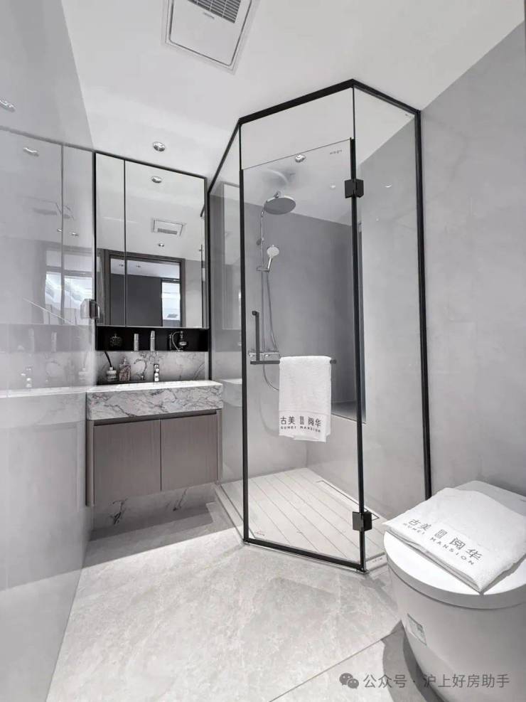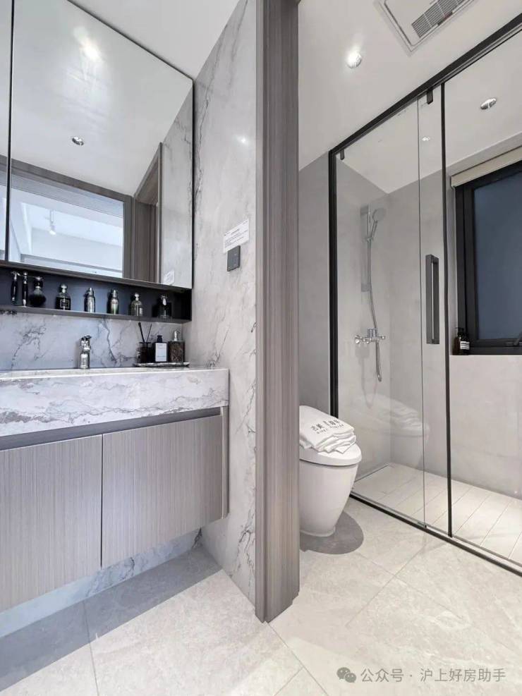 目前这一面积往往会做三房两厅一卫的设计,空间局促不说,单卫设计使用也不方便。古北阅华做了当前少有的大两房设计,每个功能区的使用面积都足够。
