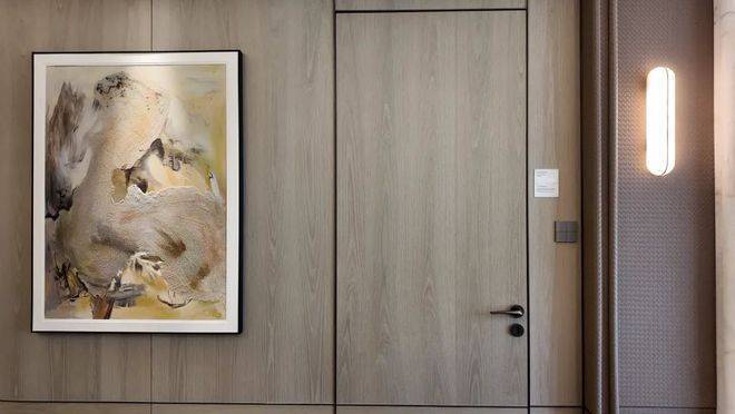 隐形门设计,保持视觉上的一致性。旁边的木饰面更“贵”,约114㎡采用橡木装饰,约126㎡采用尼斯木,多数只能在奢华酒店中、在千万级的大户型中才能见到。