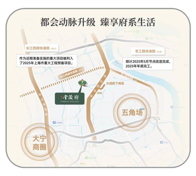 另一方面,军工路快速路新建工程预计今年年内完工(来源:上海发布),意味中环北抬今年将迈出重要一步,第二步 长江西路快速路已被列入2025年上海市重大工程清单,预计即将开工——届时,江湾金茂府就将从“中环旁”升级为“中环内”!