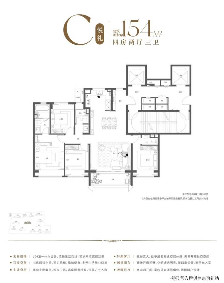 建面约154㎡的4房2厅3卫设计,户型格局方正且南北通透,四开间朝南设计,超14米的宽奢尺度,采光极好。 约9.9米的LDKB一体化空间,大进深的竖厅设计,家庭聚会、好友欢聚的不二之选!