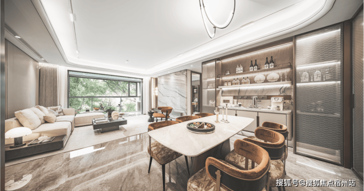 电视背景墙选用带有东方意蕴的 万里河山石材,颜值&气势都超强!吊顶、餐边柜台面、卫生间台盆等多处 圆弧设计,一方面是东方弧度美学,另一方面也是儿童友好设计,避免磕碰的人性化设计。