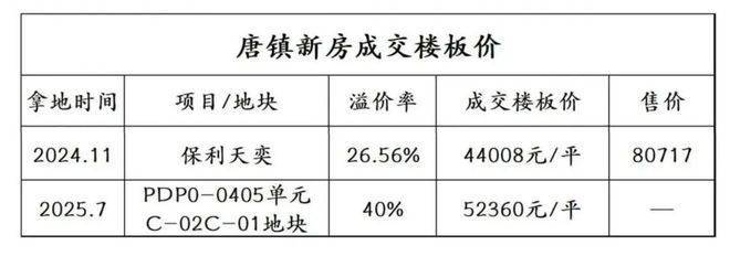 25年7月25日的土拍现场,唐镇地块的争夺堪称“白热化”。62轮报价后,楼面价定格在5.24万元/㎡,溢价率突破40%。这个数字放在唐镇,足以让市场倒吸一口凉气——要知道,2024年11月保利拿下的唐镇地块,楼面价还停留在4.4万元/㎡,短短8个月,地价涨幅近20%。