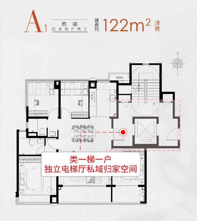 该户型类1梯1户设计,享类独立电梯厅,出入更具仪式感。