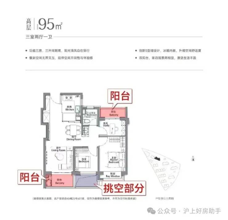 再加上南向大面宽短进深、全卧飘窗、L型转角阳台设计,哪怕小户型89㎡3房,尺度感都超棒,采光和视野更是一流。