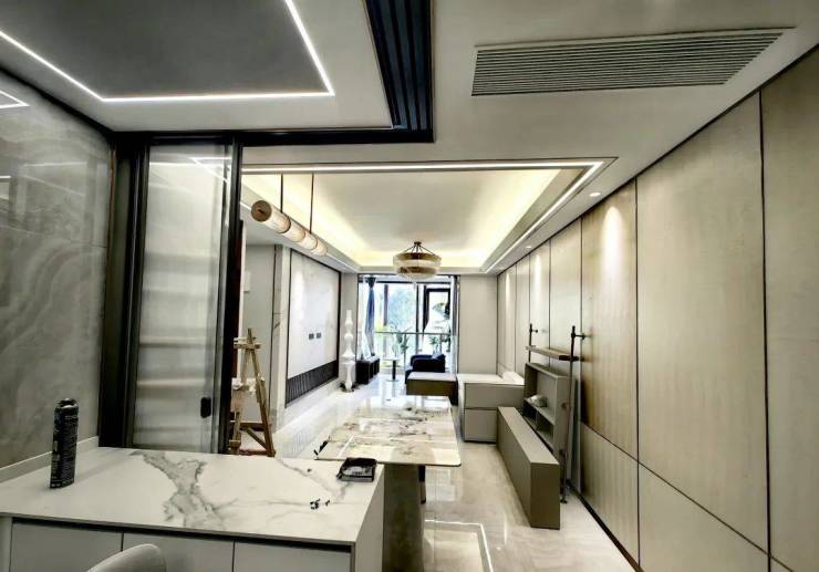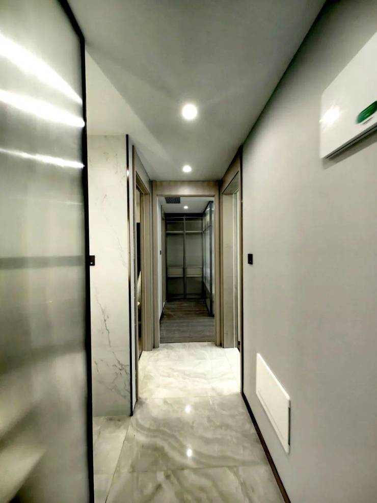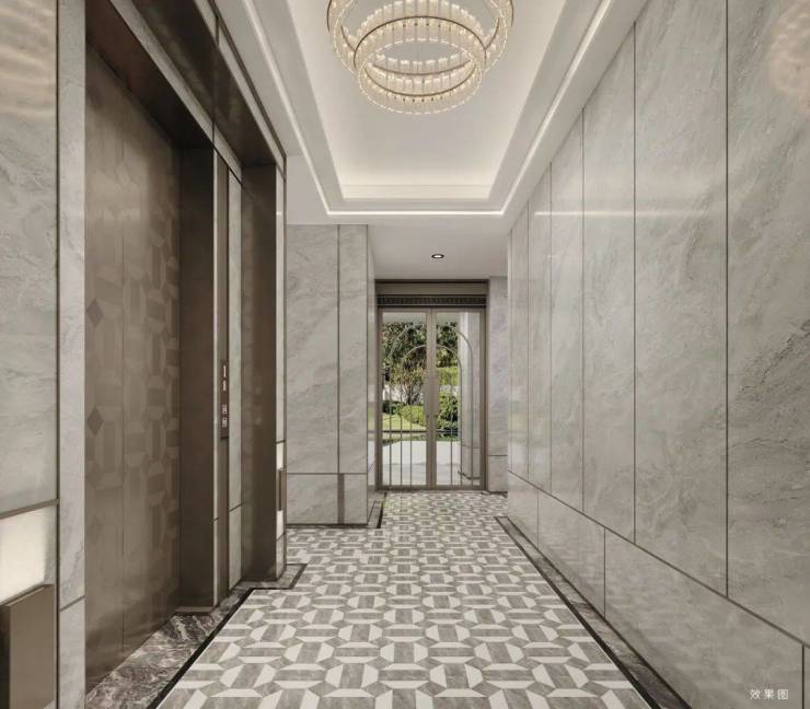 首层入户大堂,石材搭配金属装饰条的地面、墙面,空间宽敞气派,质感十足。