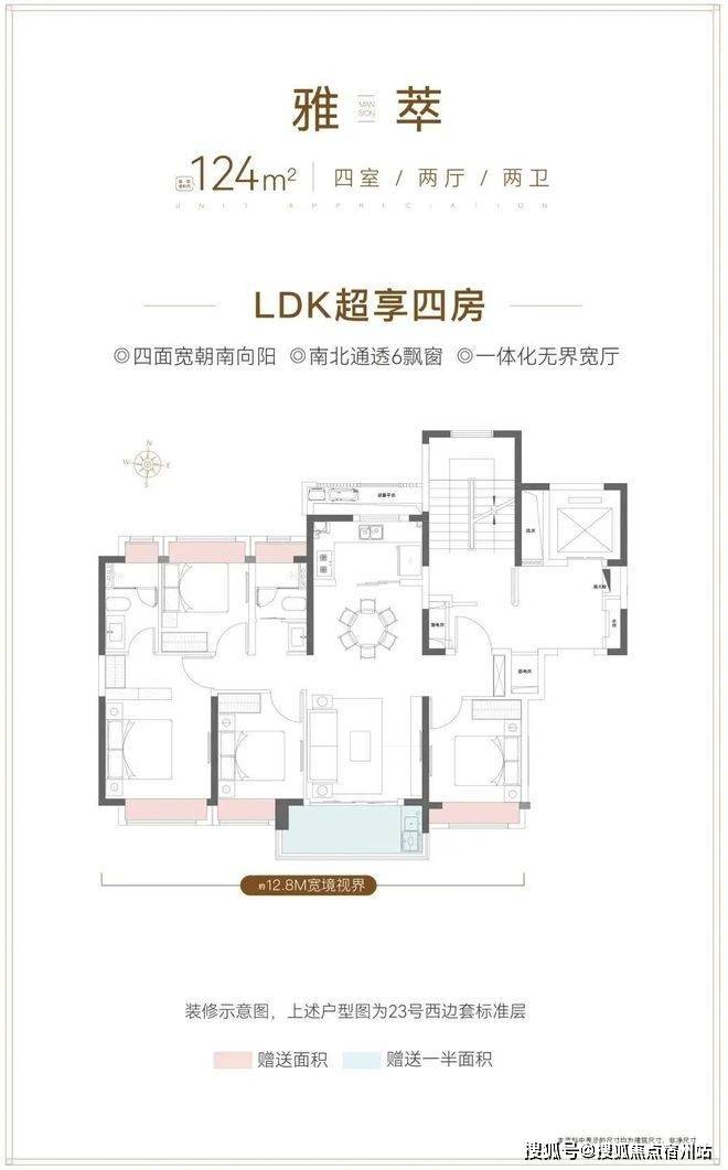 来看看更大一点的户型——建面约124㎡四房,同样是飞机户型设计,并拉伸至4开间,南向整体约12.8米面宽,空间感和舒适度拿捏到位。