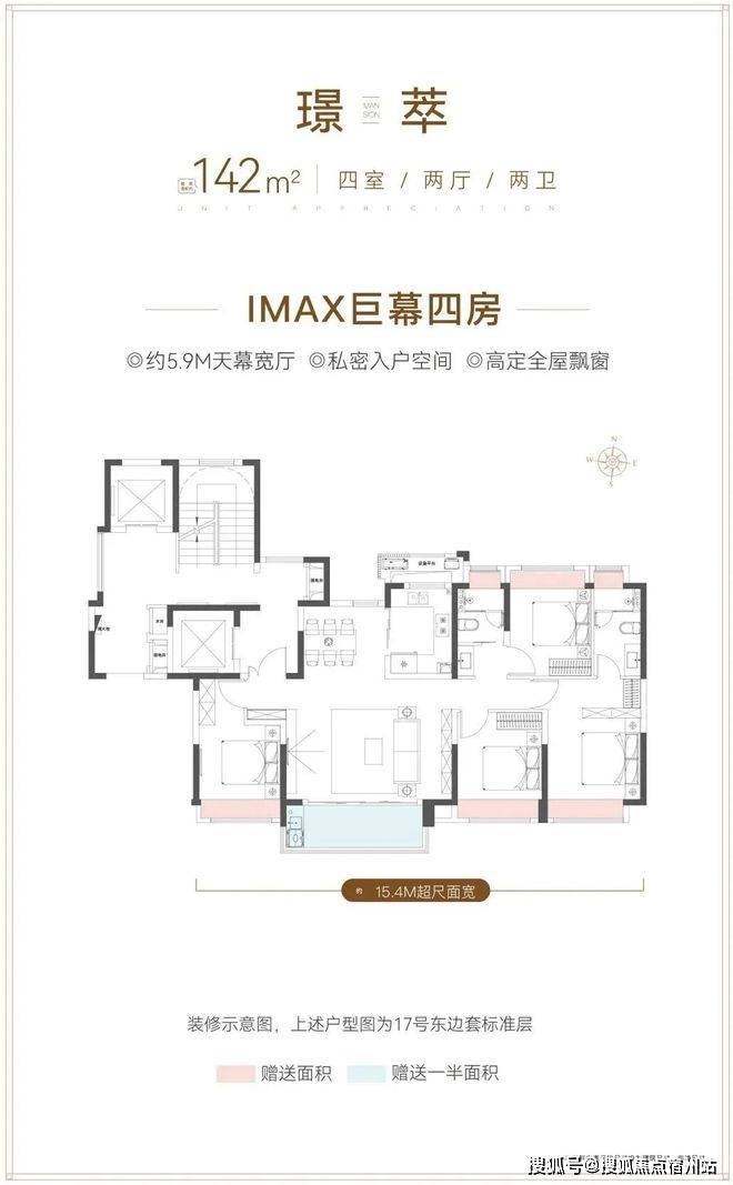 倘若拥有更高的预算,那么这套建面约142㎡4房2厅2卫非常适合改善家庭的需求。其南向面宽达到了15.4米,比肩豪宅平层产品的气场和尺度感。