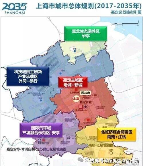 根据上海2035规划,嘉定将 形成“一核四区”功能布局: 嘉定主城区是核心,四区是指虹桥综合商务区(也就是南翔和江桥)、科技城自主创新产业承载区(徐行和外冈)、安亭国际汽车城产城融合示范区、华亭嘉北生态涵养区。