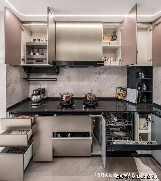 厨房的收纳空间几乎能填满整个厨房空间,这些收纳空间不是随意塞满的,而是根据日常烹饪习惯的频率来贴心规划。