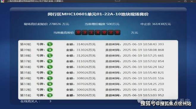 6月19日,闵行1幅地块出让,地块名称为颛桥镇MHC10601单元01-22A-10地块,规划用地性质为住宅用地,出让面积4.05公顷,容积率为2。经过40轮竞拍,最终由上海保利城市发展有限公司竞得,总成交价314026万元,溢价率12.95%。