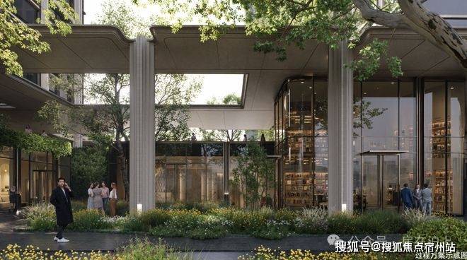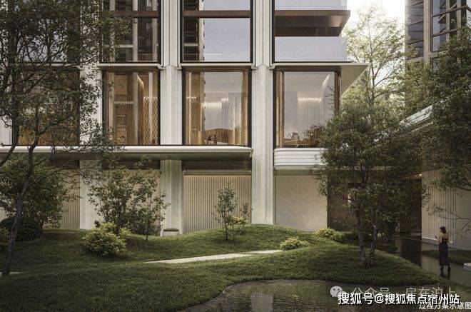 穿过园林,上海最大的约3500㎡下沉水院构成社区的核心灵魂,约13米的高差形成独特的“峡谷绿洲”,将黄浦江的水意象引入社区,中央平静水面与四周的会客舱、茶室、游泳馆形成呼应。