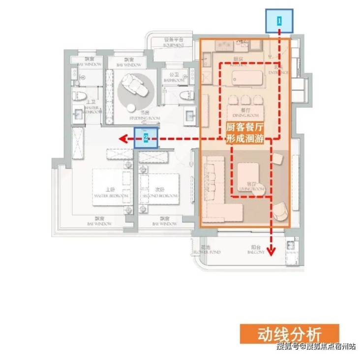 在交通流线方面,考虑引入了“洄游”动线的设计,这样可以起到串联空间,提高家务效率的同时,当然还能 让空间“显大”!(如下图)