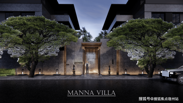 项目采以经典三段式别墅立面,中灰色石材为基座,奢石宁静与土地矜贵互为映衬。中灰色石材的厚重感,深灰色铝板的舒展度,“安缦金”高奢质感勾勒边框,与蓝眼睛光面石砖、冰花蓝光面石材的交织下,呈现出“天光云影、浮光跃金”的意境。