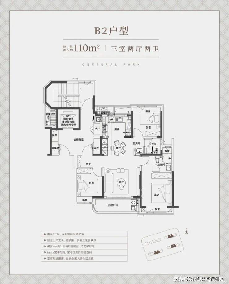 建面约110㎡边套(B1户型),1个宽面阳台、5个飘窗,整体南向面宽做到了约12.3米,大横厅面宽约5.4米,带来超大空间体验和充足通风采光。