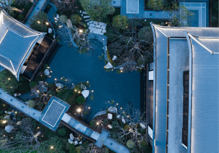 居山水观天地,是中国人的最高理想,漫御道而行,入院即是入画,叠山理水,层层递进,舒展青绿山水画境。