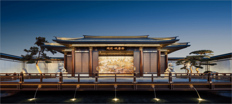入境观唐,尺度威仪的唐风大门,面宽约40米,高约9.6米,屋顶采用“重檐歇山顶”形式,彰显中式门第尊崇之礼。