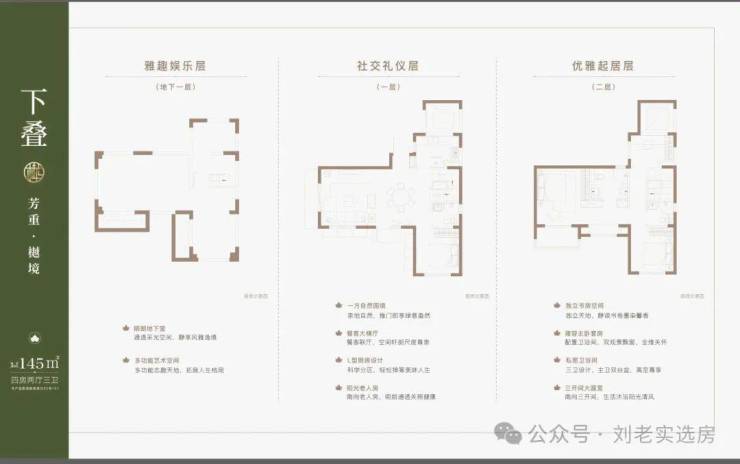 一层是会客区,大尺度横厅,可以打造客餐厅,采光条件优越,还配备了颐养房,方便家中老人居住。二层双南大套房+南向阔景飘窗+三卫的设计,空间层层递进,尊崇有序。
