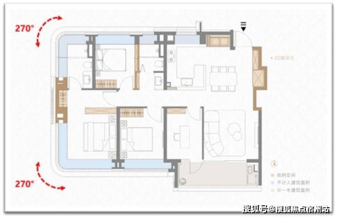 第三处山墙s墙的技术含量更高,直接让户型拥有两个大转角飘窗(主卧+主卫均双270°弧形转角飘窗)。凹处填放一个衣柜,视觉效果舒适,业主第一眼无知无觉,殊不知背后大有玄妙。