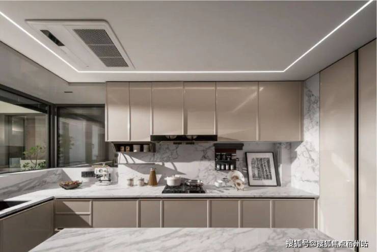 厨房的巨量收纳系统,超大尺度的中西岛台,既符合中式烹饪的实用逻辑,预留足够操作台面,又能承载西式社交,还有新颖的转角蝶形收纳——
