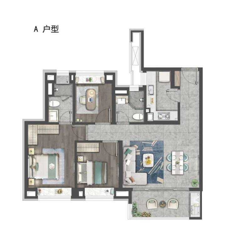 高层99㎡三房两厅两卫(中间套)样板间户型