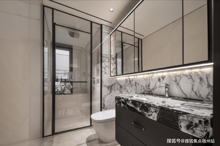 ✔卫生间地面和墙面整体性也非常强,奢石台面的纹路和岩板墙面和协调。