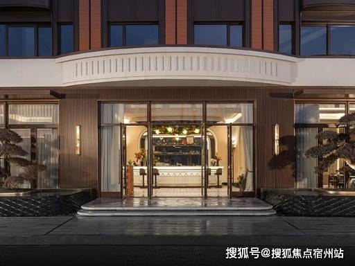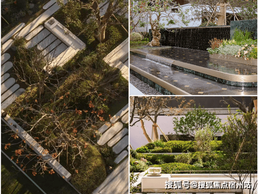 水畔之汀(主入口):海派弧形收边,幻影蓝流水墙 + 普拉达绿景墙 + 奢金影灯,移植百年桩景红果冬青与进口红枫,仪式感拉满。