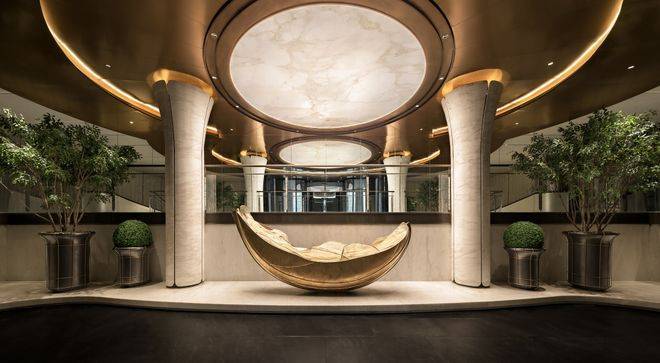 大门两侧,矗立的巨型花钵,表面镶嵌着来自意大利的“翡翠星河”超薄奢石,蕴藏着如宇宙星痕般的细腻脉络,花钵之上,傲然挺立着远渡重洋而来的爱知县的老桩茶梅盛迎业主归家。举步徐行,来到致敬金贝尔美术馆打造的「天穹光廊」,长廊的地面由蓝翡翠奢石+纯净汉白玉+温润的温德姆灰石材3种奢石,经过精细切割与拼花,复现了香港中银大厦极具几何美学的拼花,中轴对称的庄严格局,将空间升华为博物馆级的艺术殿堂。