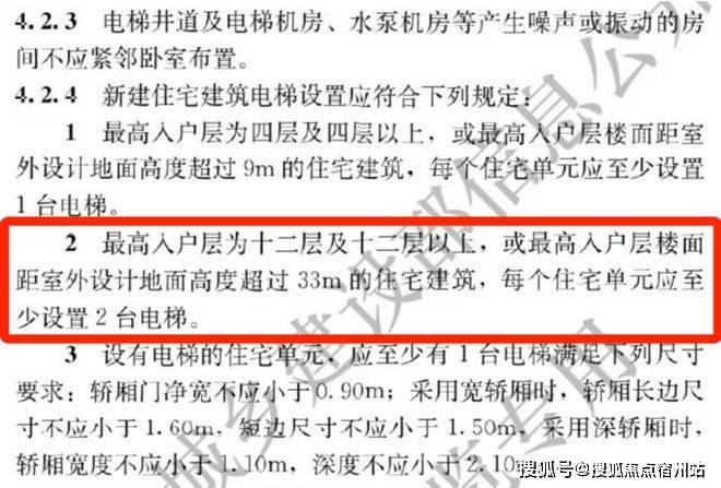 ② 5.1起执行住宅新国标,最高入户层为十二层及十二层以上,或最高入户层楼面距室外设计地面高度超过33m的住宅建筑,每个住宅单元应至少设置2台电梯。
