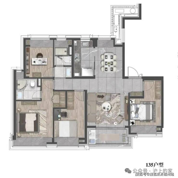 该户型贴合当代人居生活习惯,既适合三口之家小太阳家庭,也可以是三代同堂,每个人都能拥有独立空间。