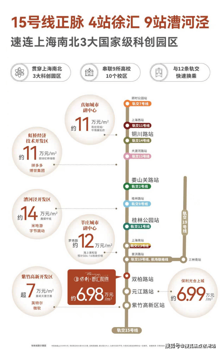 对于科创人才与主城改善人群来说,便捷高效的交通是品质生活的基础,保利・都汇和煦坐拥 “双轨交 + 三横三纵路网” 的多维交通网络,无缝衔接全城核心区域,告别通勤拥堵,高效平衡工作与生活。轨道交通方面,步行约 500-650 米可达地铁 15 号线双柏路站,步行仅需 5-10 分钟,15 号线作为上海西部南北向大动脉,4 站直达徐汇、9 站抵达漕河泾开发区,可无缝换乘 1、2、3、4、7、9 等多条线路,快速通达徐家汇、静安寺、人民广场、虹桥枢纽等核心商圈;同时距离 5 号线银都路站约 1.1 公里,步行 13 分钟可达,可直达莘庄、剑川路等商圈,进一步拓宽生活与通勤半径。