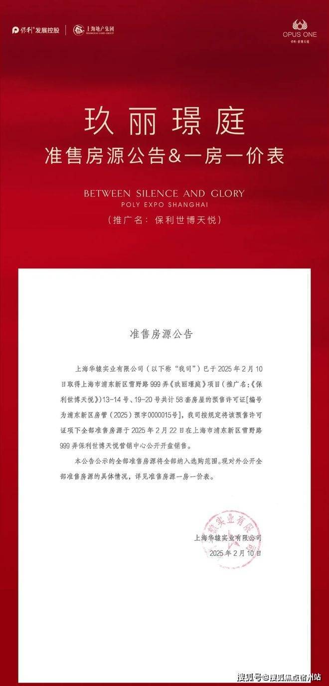 1、项目推广名为“保利·世博天悦”,地名核准名/备案名为“玖丽璟庭”,开发公司为:“上海华辕实业有限公司”;预售证号:浦东新区房管(2025)预字0000015号;2、本资料为要约邀请,不作为要约或承诺;3、相关宣传内容不排除因政府相关规划、规定及出卖人分期规划、未能控制等原因而发生变化;4、买卖双方的权利义务以双方签订的商品房买卖合同及其补充协议、附件等书面文件为准;5、本宣传材料所涉及户型仅供示意参考,具体以政府部门最终审定的图纸和销售合同为准,本资料所涉及面积皆为预估面积,相同户型单位因楼栋、楼层、单元等差异,局部结构、形式、面积、装饰等可能有所不同,且预估面积与实际面积可能存在差异,面积最终以房管局测绘为准。户型图中装修、家具、电器等设备仅为示意,不属于交付内容和交付标准,实际部品的选型和房间空间尺寸根据户型情况,略有差异,以现场实际为准;6、本宣传资料中涉及的价格、折扣、付款方式等信息,因销售时间、户型楼栋、楼层、方位等不同有所差异,以双方签订的商品房买卖合同及其补充协议、附件等书面文件为准;7、本资料所发布的内容为2025年2月的信息,敬请留意最新资料。