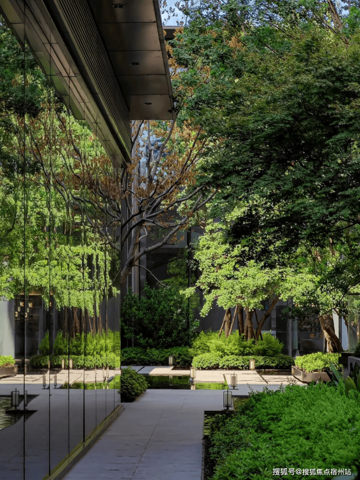 走进来,便是满眼绿意的下沉式景观庭院,拾级而上,两侧景观在阳光的照耀下呈现出非凡的光影,还有潺潺流水相伴,带来度假式的沉浸体验。