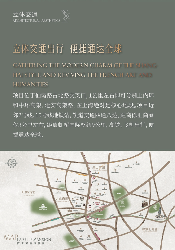 项目地处古北路与仙霞路黄金十字轴正心,距离黄金城道仅约1.7公里,坐拥古北CBD繁华商圈,北接古北商务区、东靠徐家汇商圈、南面是漕河泾开发区、西临大虹桥商务区。☑️☑️古北望晶售楼处电话:400-1183-605☑️☑️