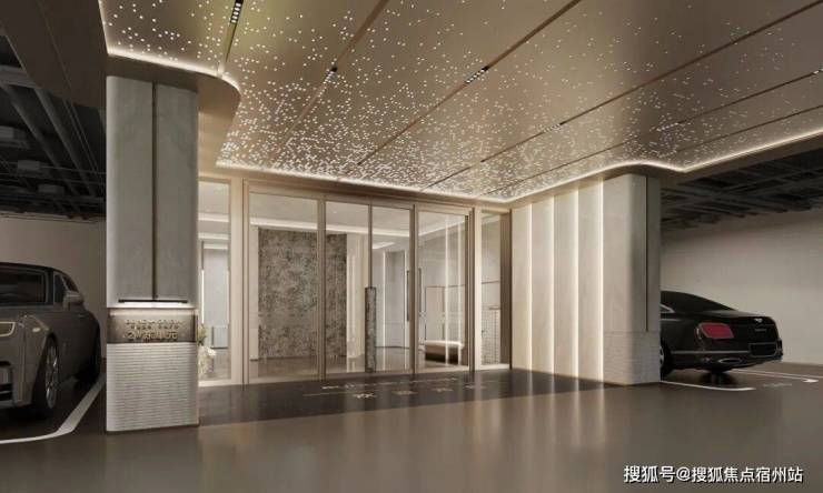 公区配套都如此高了, 双大堂 就更不可少了。首层大堂结合金属连廊,配以大面积的玻璃幕墙,4米挑高;地下大堂则直接连接了停车系统,整个地下空间做了天地墙的材料铺设,其中地下的落客区用了星光顶,地面是水墨地坪,车库的入口用的是铝板和石材。