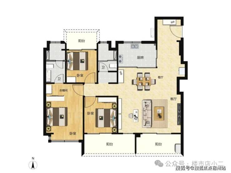 建面约127㎡ 的大三房则设计有南北三阳台,是板块内的稀缺产品。这类大户型采用主卧套房设计,配备独立卫浴与步入式衣帽间。