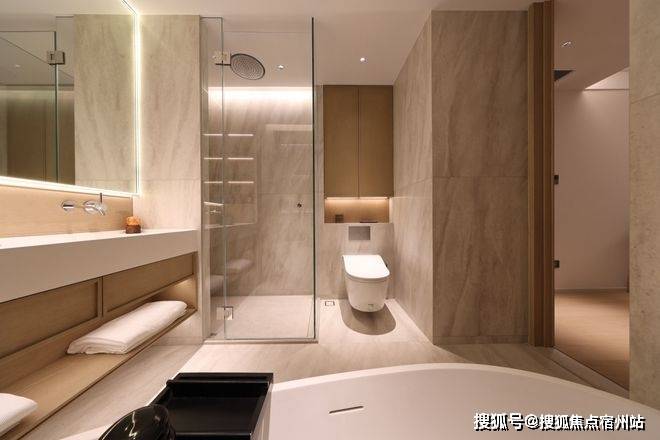 入墙式的水龙头和顶喷,风格极简化;1200mm*1200mm超大规格瓷砖,造价更高,也更加美观,更具整体性。