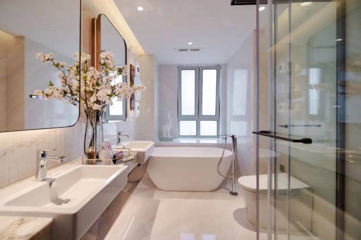 卫生间墙面主材为"南斯拉夫白";建面188 m²主客卫洗台背景墙使用巴西沁园春雪;☑️☑️宝华紫薇之星售楼处电话:400 - 8377 - 020☑️☑️