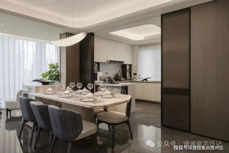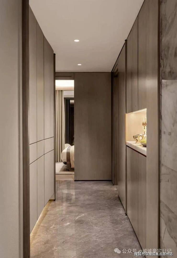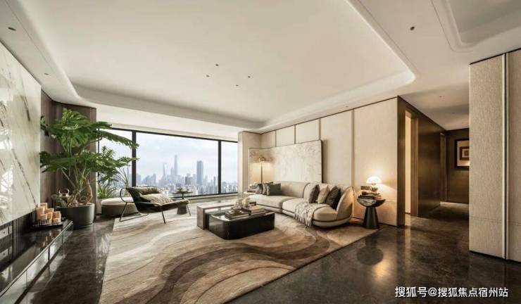 室内大量铺设珍稀石材, 客厅背景墙选用意大利阿普那的奢石,为了呈现更好的视觉效果,金茂 不惜成本做立体弧面造型处理,地面采用 香奈儿灰、星耀灰等大理石拼花,餐边柜、主卧衣柜、梳妆台均纳入交付范围。